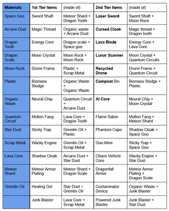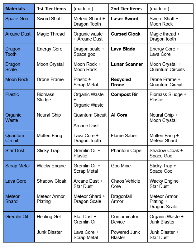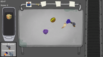 The Game takes place in a space junk yard. The player receives drops of junk from visitors. Junk breaks down into a bunch of different materials, which the player can use to make 1st tier items. Those can then again be merged with more material, to make 2nd tier items. Items can also be broken down into the materials they were made of. The junk yard will receive orders for items that need to be delivered which the player has to send off. The game can be played endlessly with a (high-)score for the amount of deliveries made.